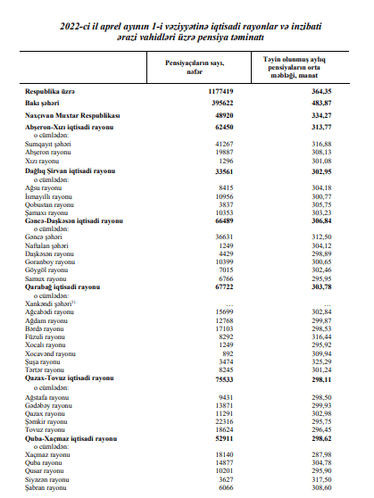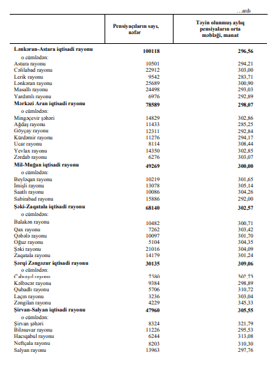 Paytaxt Bakıda orta aylıq pensiya məbləği 483 manat 87 qəpik olub. Bakıdan sonra ən yüksək orta aylıq pensiya Zəngilanda verilib. Bu rayonda orta aylıq pensiya məbləği 345 manat 33 qəpik olub. Zəngilandan sonra ən yüksək pensiyanın verildiyi şəhər və rayonlar arasında Naxçıvan (334.27 manat), Şuşa (325.29 manat), Siyəzən (317.50 manat), Füzuli (316.44 manat) ilk sırada yer alıblar.