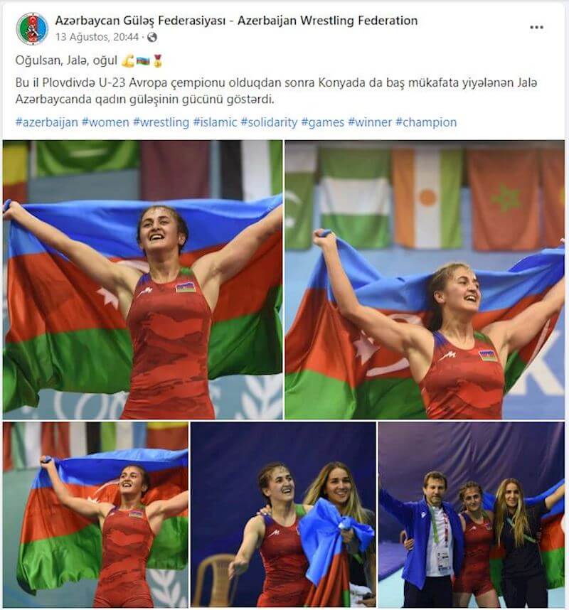 Güləşçimiz Jalə Əliyeva Türkiyənin Konya şəhərində V İslam Həmrəyliyi Oyunlarında yunan-roma güləşi üzrə qızıl medal qazanıb.