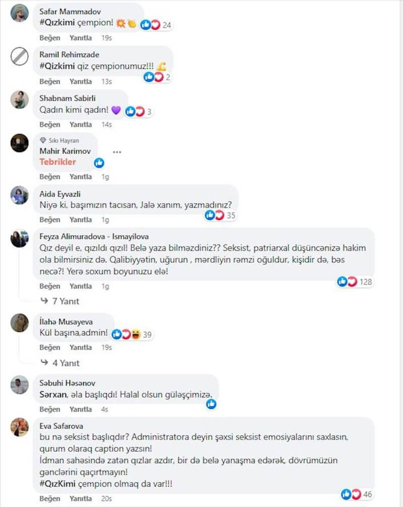 İndex.az xəbər verir ki, sosial şəbəkələrdə isə güləşçimizin uğurundan daha çox Azərbaycan Güləş Federasiyasının rəsmi səhifəsində onunla bağlı paylaşım müzakirə olunur. Belə ki, Federasiya rəsmi feysbuk səhifəsində xanım idmançımızın qələbəsini “Oğulsan, Jalə, oğul!” başlığı ilə təqdim edib. Bu isə istifadəçilər tərəfindən müzakirə və tənqidlərə səbəb olub.