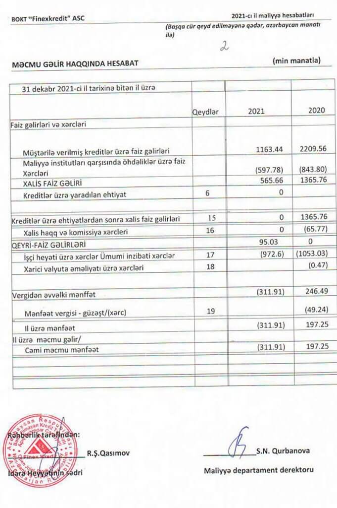 BOKT "Finex Kredit" ASC 2021-ci ili 312 min manat xalis zərər ilə başa vurub. Halbuki, təşkilat 2020-ci ili 197 min manat xalis mənfəət ilə bağlamışdı.