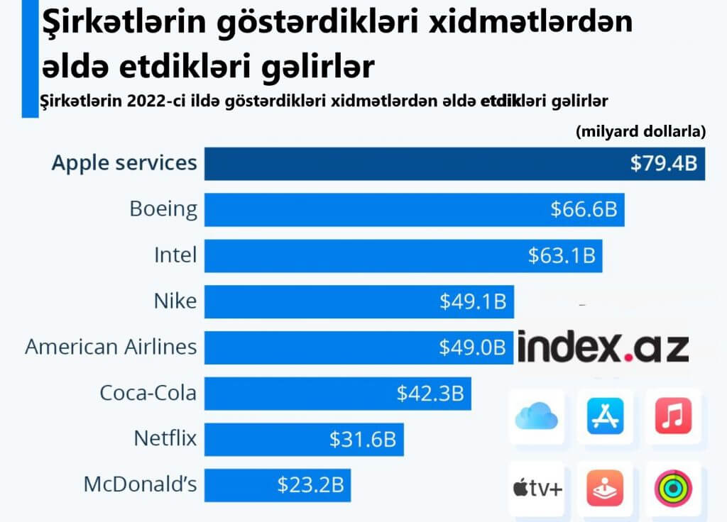 İndex.az xəbər verir ki, "Apple"ın xidmətlərdən əldə etdiyi gəlir 79.4 milyard dollar olub. Siyahıda ikinci 66.6 milyard dollarlıq gəlirlə "Boeing"dir. İlk üçlüyü göstərdiyi xidmətlərdən 63.1 milyard dollar gəlir əldə edən "İntel" bağlayır.