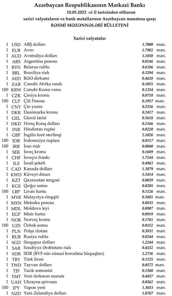 Günün rəsmi məzənnəsi