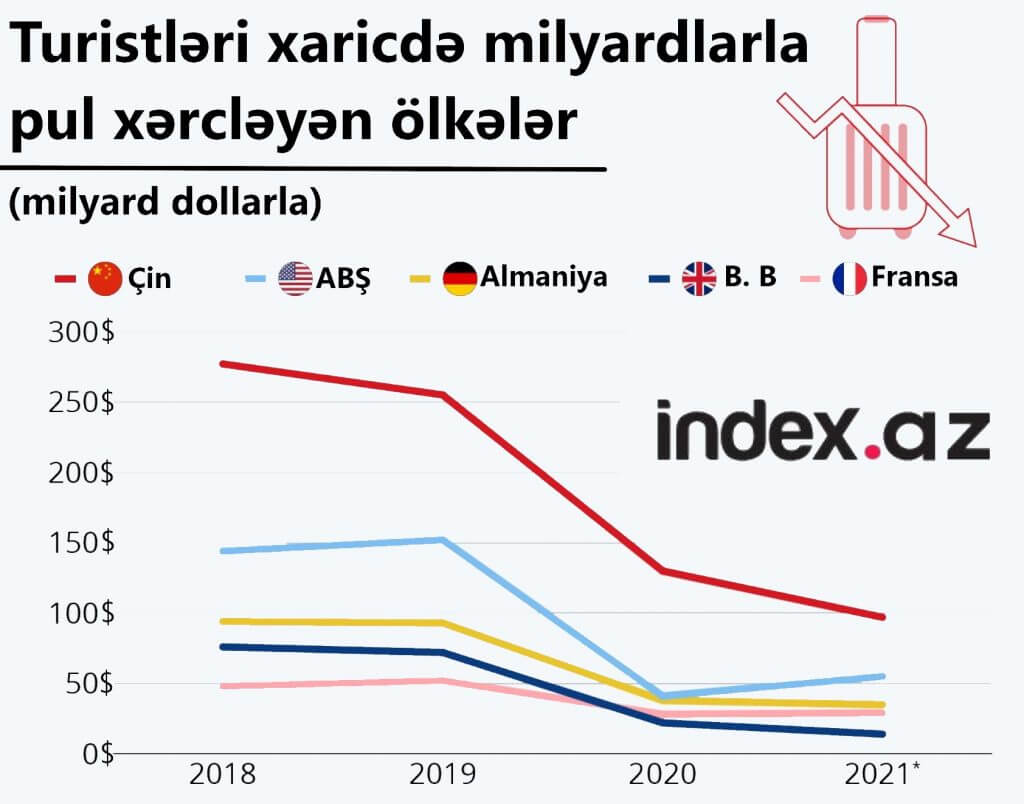 İndex.az xəbər verir ki, çinlilər 2018-ci ildə xarici ölkələrə etdikləri səfərlərlərdə təqribən 280 milyard dollar xərcləyiblər. 2021-ci ildə isə bu məbləğ 100 milyard dollara qədər enib. Buna baxmayaraq çinli turistlər hələ də bu sahədə liderliklərini qoruyub saxlayıblar.