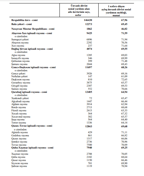 2022-ci ilin aprelin 1-i vəziyyətinə 33.4 min aztəminatlı ailənin 146.4 min üzvü ünvanlı dövlət sosial yardımı almış və onun bir nəfərə düşən orta aylıq məbləği 67.96 manat təşkil