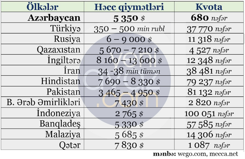 Bu il bəzi ölkələr üçün Həcc qiymətləri və Səudiyyə Ərəbistanının müəyyən etdiyi kvota aşağıdakı kimidir: