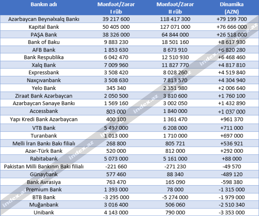 İndex.az bankların iki rüb ərzində xalis mənfəətlərinin dinamikasını araşdırıb. Bu baxımdan da ABB və "Kapital Bank" digər banklardan bir neçə baş üstündür.