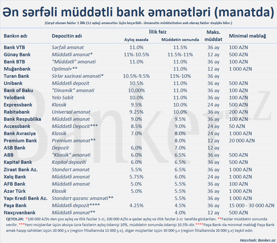İndex.az xəbər verir ki, Banker.az 2022-ci ilin may ayı üzrə manatda olan ən sərfəli müddətli əmanət təklif edən bankları və həmin depozitlər üzrə faiz dərəcələrini araşdırıb.