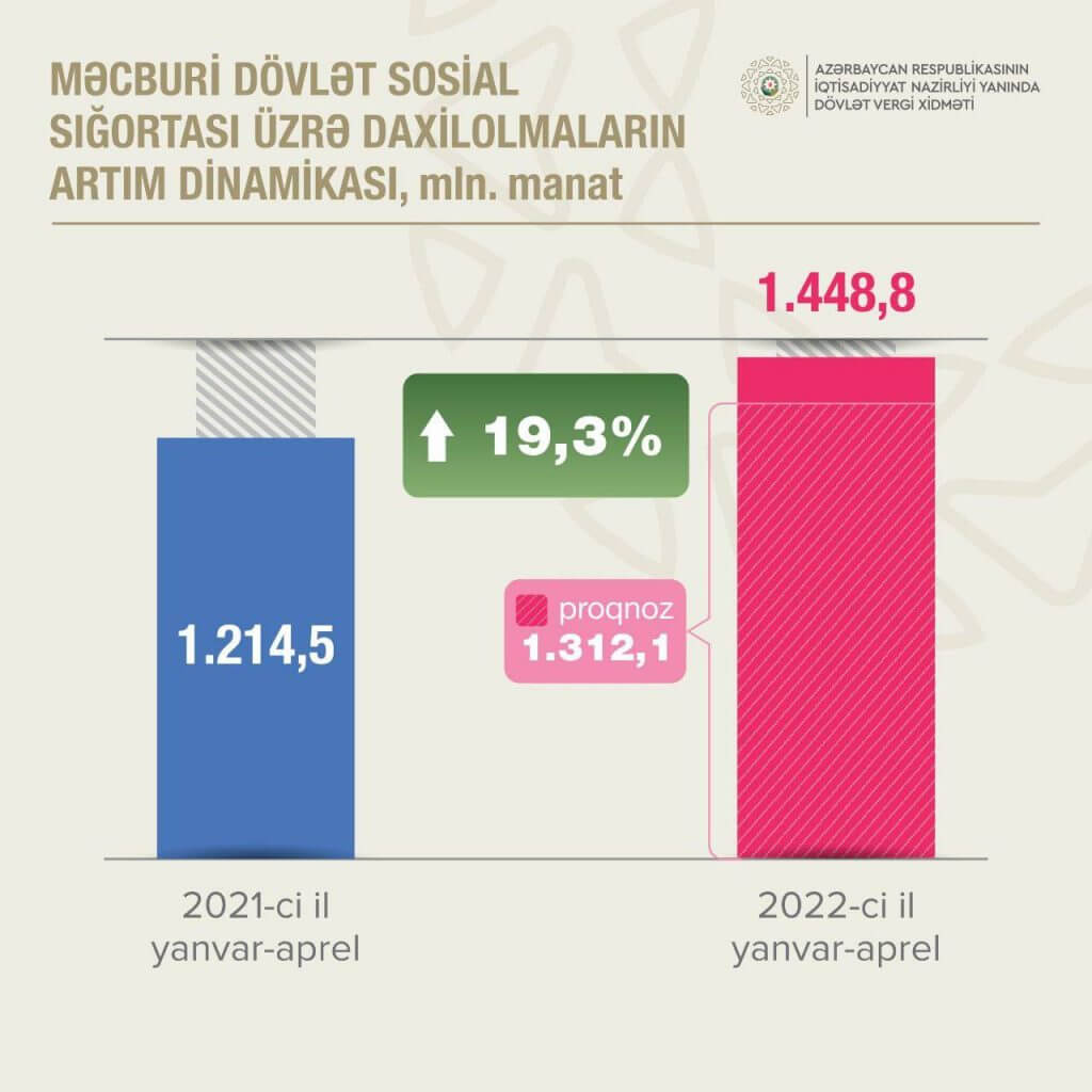 2022-ci ilin yanvar-fevral aylarında məcburi dövlət sosial sığorta üzrə vergi daxilolmaları ötən ilin müvafiq dövrü ilə müqayisədə 19.3% artaraq 1 448.8 mln. manata çatıb.