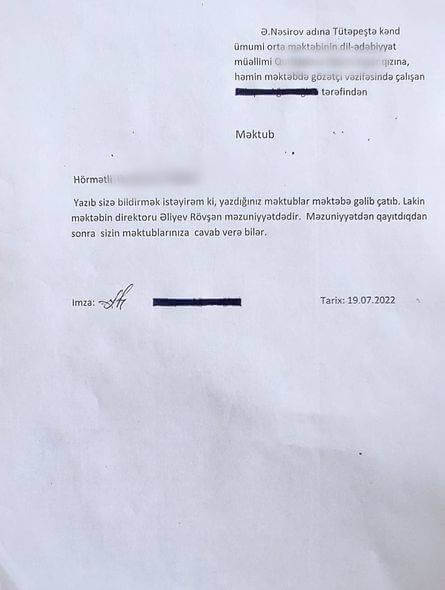 Belə ki, direktora məktub ünvanlayan müəllimlərdən birinə cavab qarovulçu adından verilib.