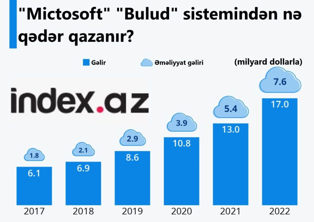 İndex.az xəbər verir ki, 2022-ci ildə "Microsoft" "Bulud" sistemindən 17 milyard dollar gəlir əldə edib.
