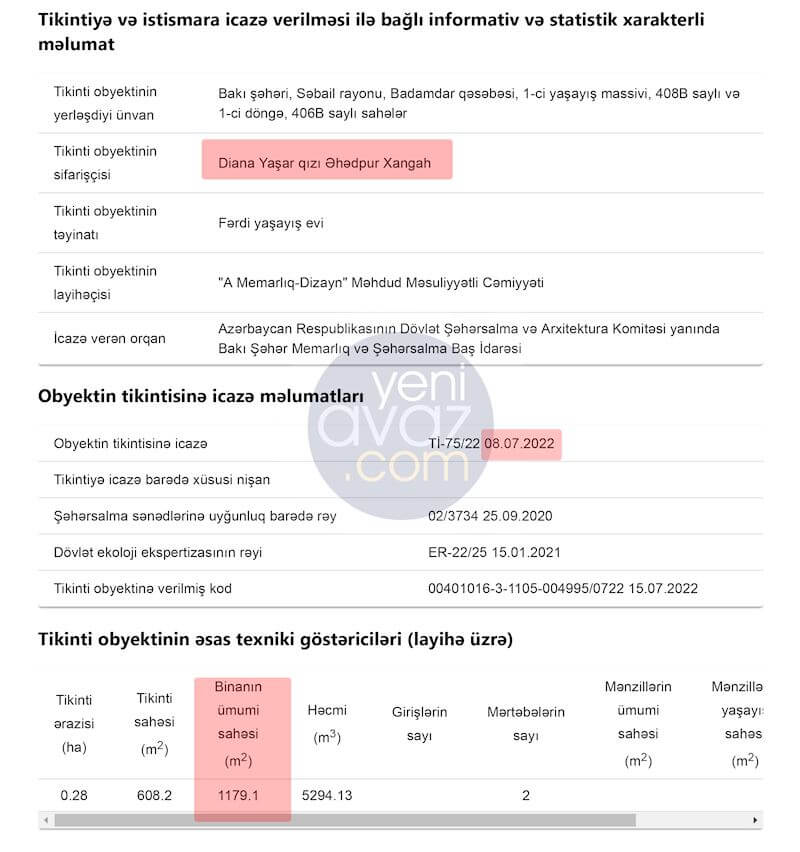 Onu da əlavə edək ki, bu il iyul ayının 8-də Dövlət Şəhərsalma və Arxitektura Komitəsi yanında Bakı Şəhər Memarlıq və Şəhərsalma Baş İdarəsi Səbail rayonu, Badamdar qəsəbəsi, 1-ci yaşayış massisvi, 408B saylı və 1-ci döngə, 406B saylı sahələrdə yerləşəcək fərdi yaşayış evinin tikintisinə icazə verib. Ümumi sahəsi 1179,1 kv. metr olan 2 mərtəbəli evin sifarişçisi məşhur azərbaycanlı modelyer Diana Yaşar qızı Əhədpur Xangahdır. Aktiv sosial şəbəkə istifadəçisi olan (1,3 milyon izləyicisi var) Diana Yaşar qızı Əhədpur Xangahın paylaşımlarından belə görünür ki, o Dubayda və İzmirdə də olduqca dəbdəbəli evlərə sahibdir. Bakıda, Dubayda və İzmirdə “Diana Əhədpur” adlı geyim mağazalarına sahib olan 36 yaşlı modelyer 70 yaşlı məşhur iş adamı Mənuçehr Əhədpur Xangahın həyat yoldaşıdır. Mənuçehr Əhədpur Xangah eyni zamanda peşəkar “poker” oyunçusu kimi də tanınır.