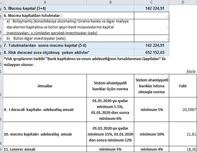 İndex.az xəbər verir ki, bankın lisenziyasının ləğv edilməsinin səbəblərdən biri məcmu kapitalının miqdarının banklar üçün müəyyən edilmiş minimum miqdarından (50 milyon manat) az olması və məcmu kapitalının adekvatlıq əmsalının (minimum 10%) 3%-dən az olmasıdır.