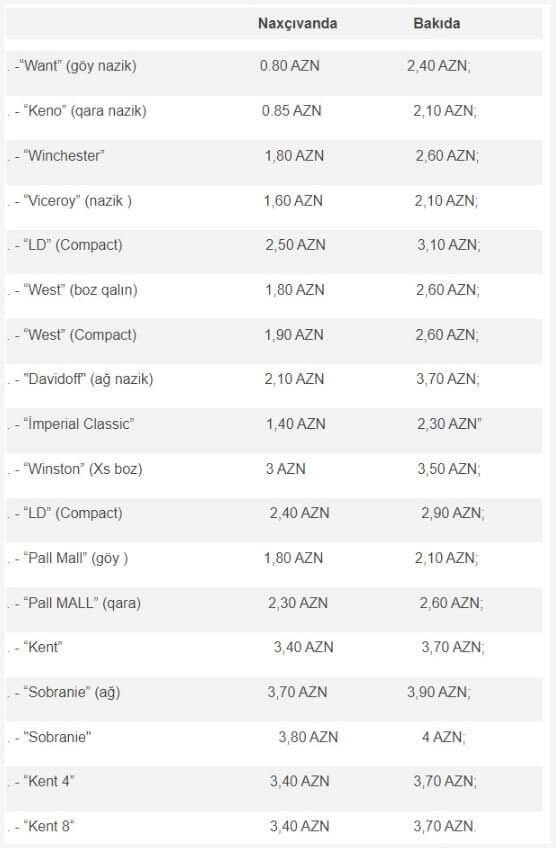 Paytaxt mağazalarında aparılan müşahidələrə əsasən, 20 gün əvvələ qədər “Sobranie” siqaretinin qiyməti 3,90 manat idisə, hazırda bəzi satış məntəqələrində 4,30 - 5 manat aralığında təklif olunur. Eynilə “Winston” 3,20-dən 3,80-ə, “Kent-4” 3,70-dən- 3,90-a, “Davidoff studio” 3,60-dan 4 manata, “Winston” ballı isə 3,50-dən 3,80 manata qədər bahalaşıb. Hazırda paytaxt mağazalarında digər markalarla müqayisədə nisbətən normal hesab olunan siqaretlərin qiyməti 3-4 manatdan ucuz deyil. Daha ucuz və keyfiyyət baxımından yaxşı olmayan siqaretlərin qiyməti isə iki manatdan başlayır.