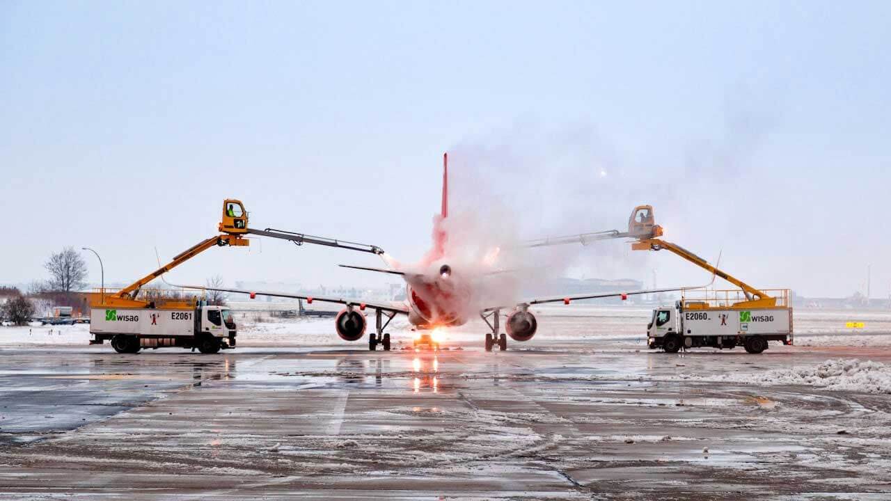 "De-icing" (buzdan təmizləmə) təyyarənin qanadları, quyruğu və gövdəsi kimi kritik səthlərində yığılmış buz, qar və ya donmuş suyun təmizlənməsi prosesidir. Bu proses zamanı adətən su və qlikol (bir növ spirt) qarışığı olan bir maye püskürtülür.