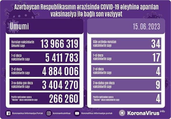 Vurulan vaksinlərin ümumi sayı 13 966 319, birinci mərhələ üzrə vaksinasiya olunanların ümumi sayı 5 411 783, ikinci mərhələ üzrə vaksinasiya olunanların sayı 4 884 006, üç və daha çox doza üzrə vaksinasiya olunanların sayı 3 404 270, pozitiv nəticədən sonra buster doza üzrə vaksinasiya olunanların sayı isə 266 260 nəfər təşkil edir.