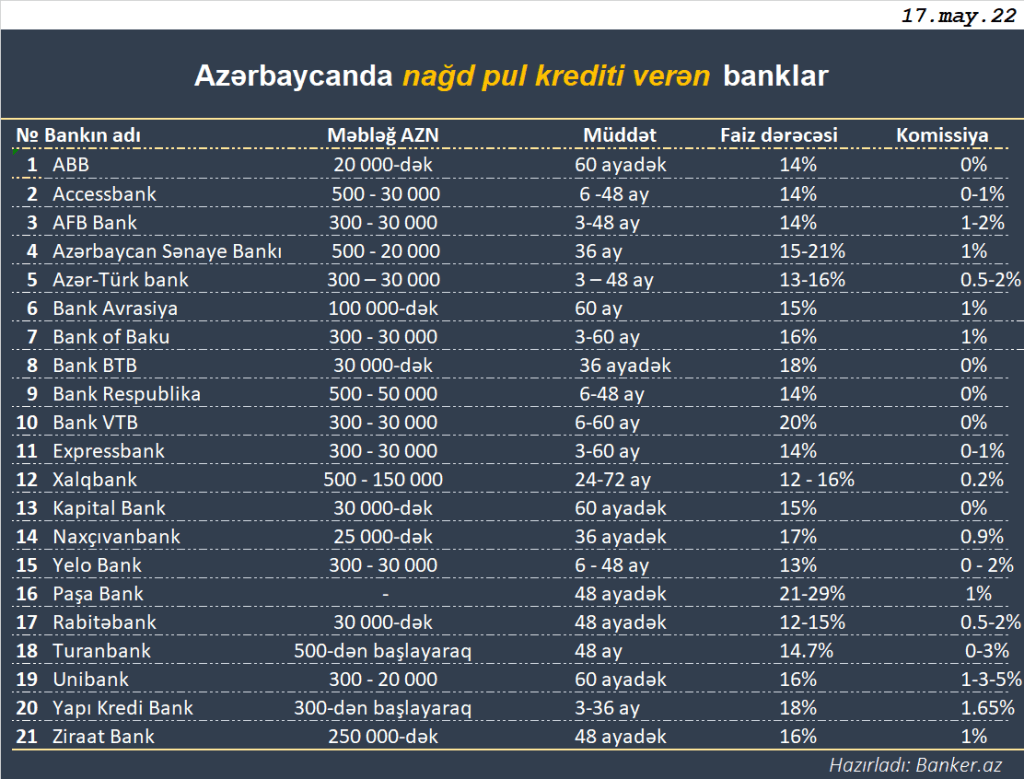 İndex.az xəbər verir ki, Banker.az may ayı üzrə istehlak kreditinin bir növü olan nağd kredit verən bankları araşdırıb.