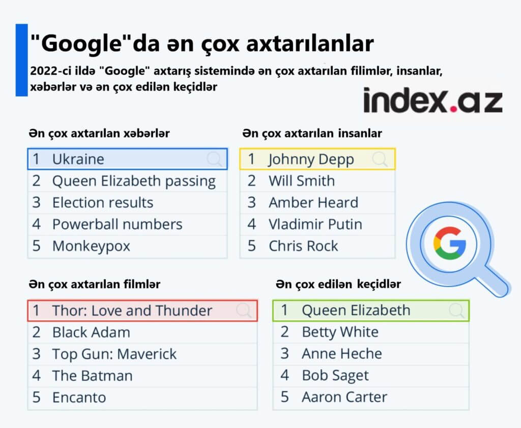 İndex.az xəbər verir ki, ötən il "Google"da axtarlan xəbərlər arasında "Ukrayna" adı altında axtarılmış xəbərlər liderdir. Qalmaqallı məhkəmə prosesinə görə ən çox axtarılan insan isə "Johnny Depp" olub. Filmlər arasında "Thor: Love and Thunder" filmi, keçidlər arasında isə, ölümü səbəbindən "Queen Elizabeth" adına daha çox keçid edilərək axtarılıb.