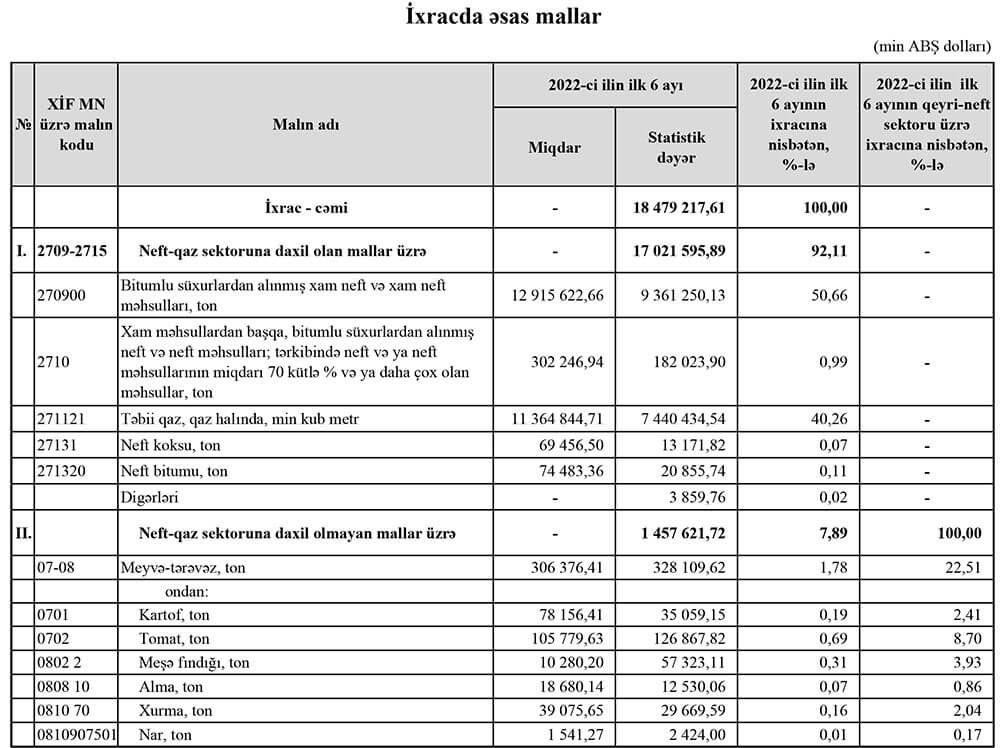 2022-ci ilin 1-ci yarısında (yanvar-iyun dövründə) Azərbaycanın 18 milyard 479 milyon dollarlıq ixracın 17 milyard 22 milyon dolları və ya 92,11%-i neft-qaz sektoruna daxil olan mallar üzrə olub.