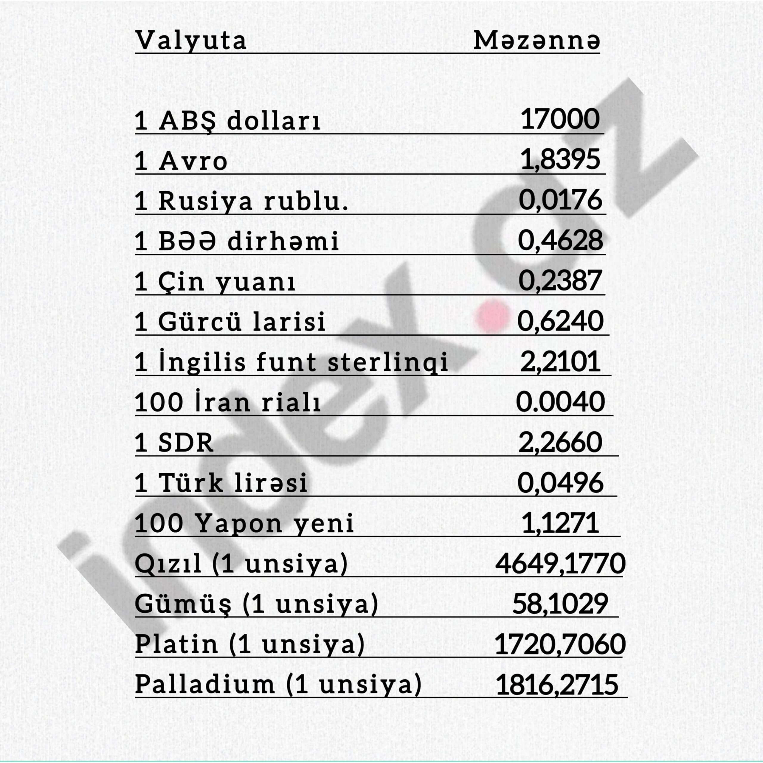 ValyutaMəzənnə1 ABŞ dolları1,70001 Avro1,9811100 Rusiya rublu2,12161 Avstraliya dolları1,13841 Belarus rublu0,57781 Bolqarıstan levi-1 BƏƏ dirhəmi0,46...