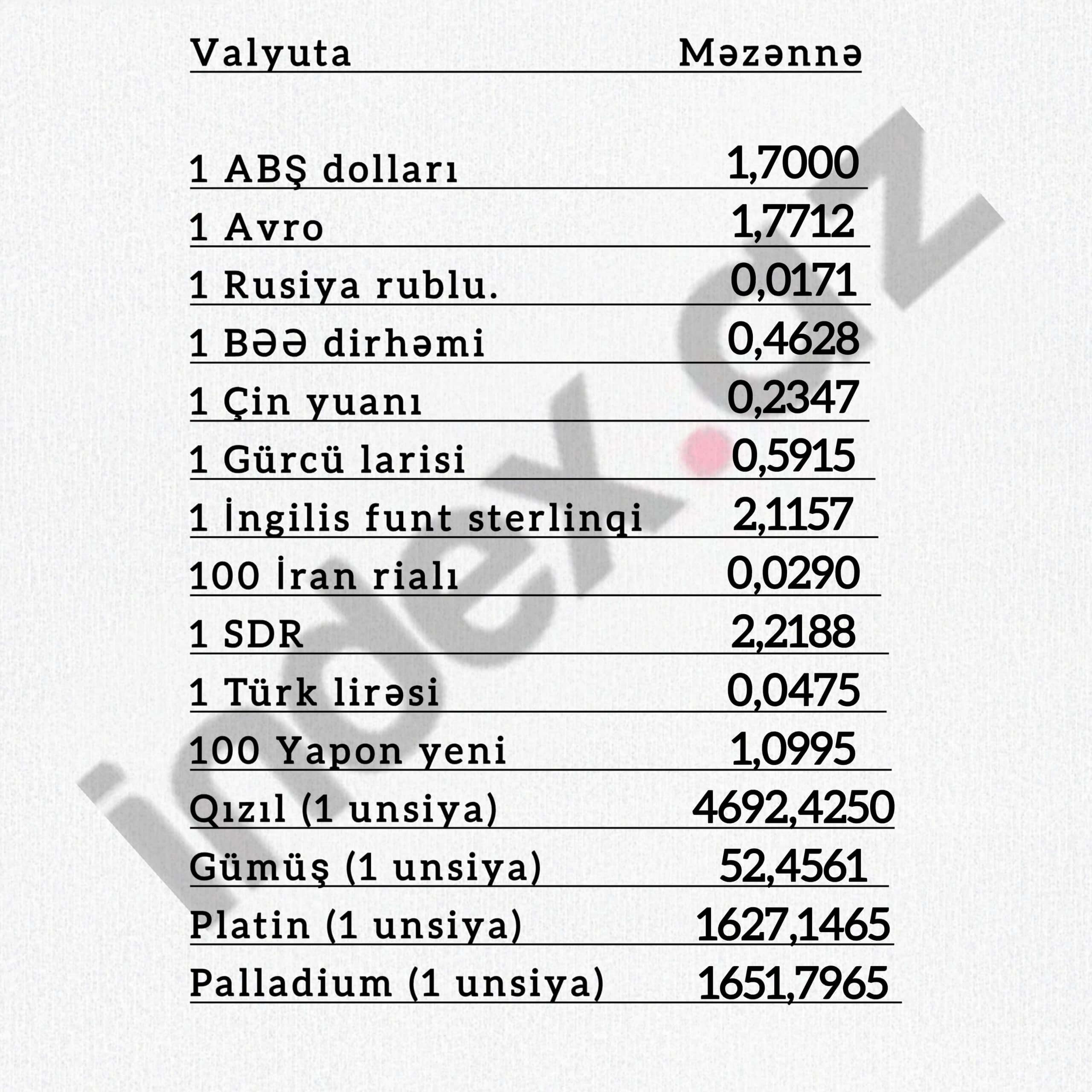 ValyutaMəzənnə1 ABŞ dolları1,70001 Avro2,0032100 Rusiya rublu2,19371 Avstraliya dolları1,14031 Belarus rublu0,58701 Bolqarıstan levi1,02411 BƏƏ dirhəm...