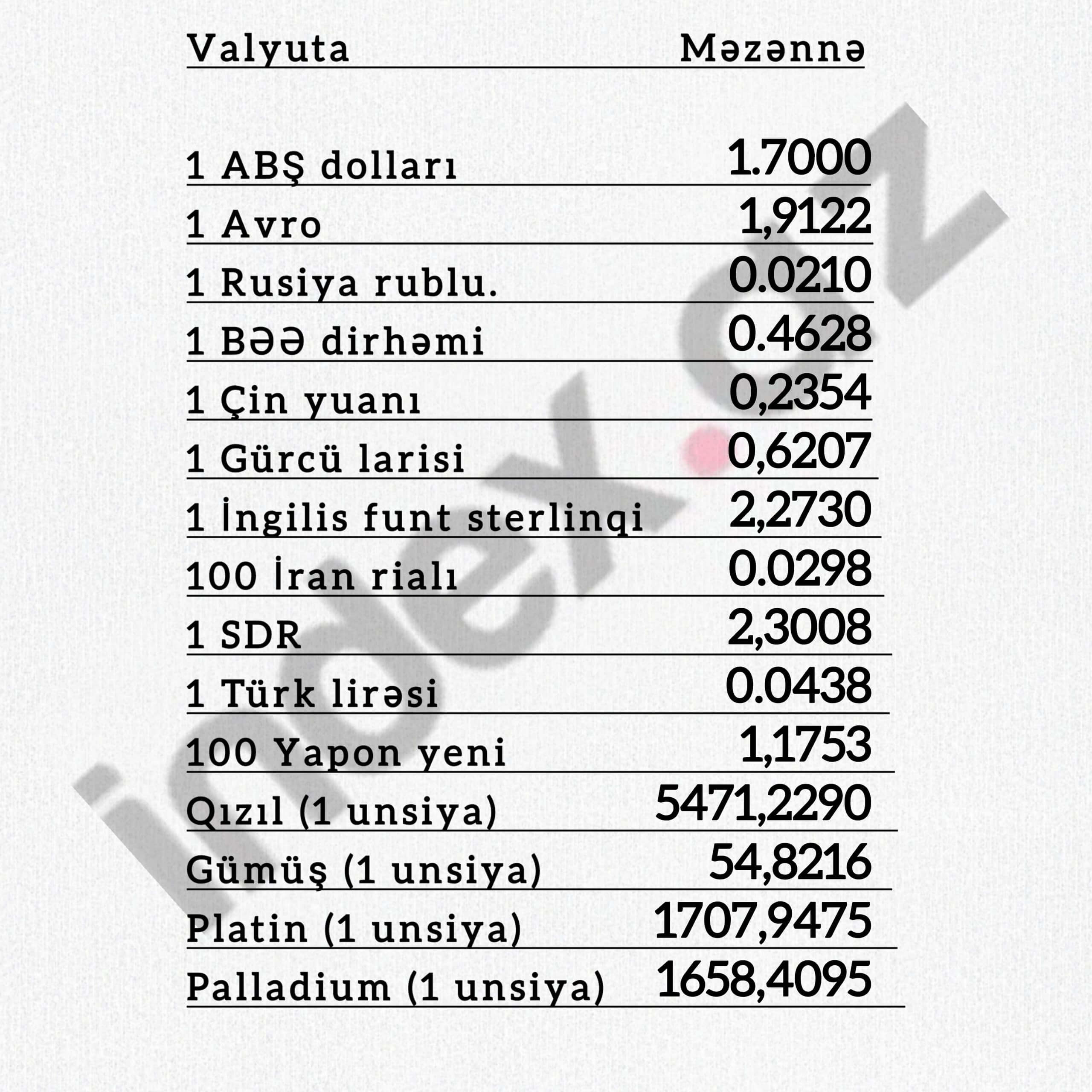 ValyutaMəzənnə1 ABŞ dolları1,70001 Avro1,9921100 Rusiya rublu2,12801 Avstraliya dolları1,12351 Belarus rublu0,58701 Bolqarıstan levi1,01861 BƏƏ dirhəm...