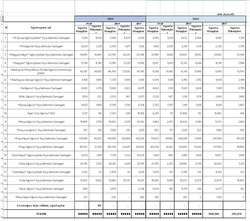 Ən az sığorta haqqı toplayan şirkətlər isə 1,1 milyon manatlıq yığımla "Meqa Həyat Sığorta”, 1,4 milyon manatlıq yığımla "Naxçıvansığorta" və 2,7 milyon manatlıq yığımla "Ata Sığorta" şirkətləri olub.