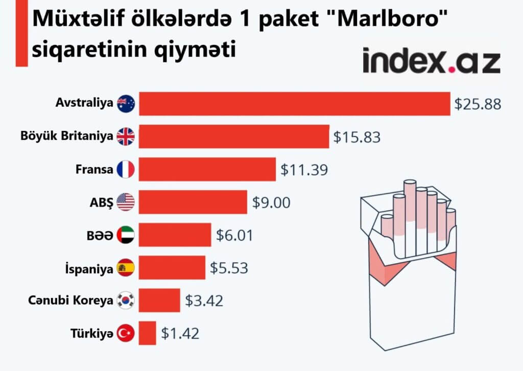 İndex.az xəbər verir ki, Avstraliyada bir paket "Marlboro"nun qiyməti 25.88 dollardır.