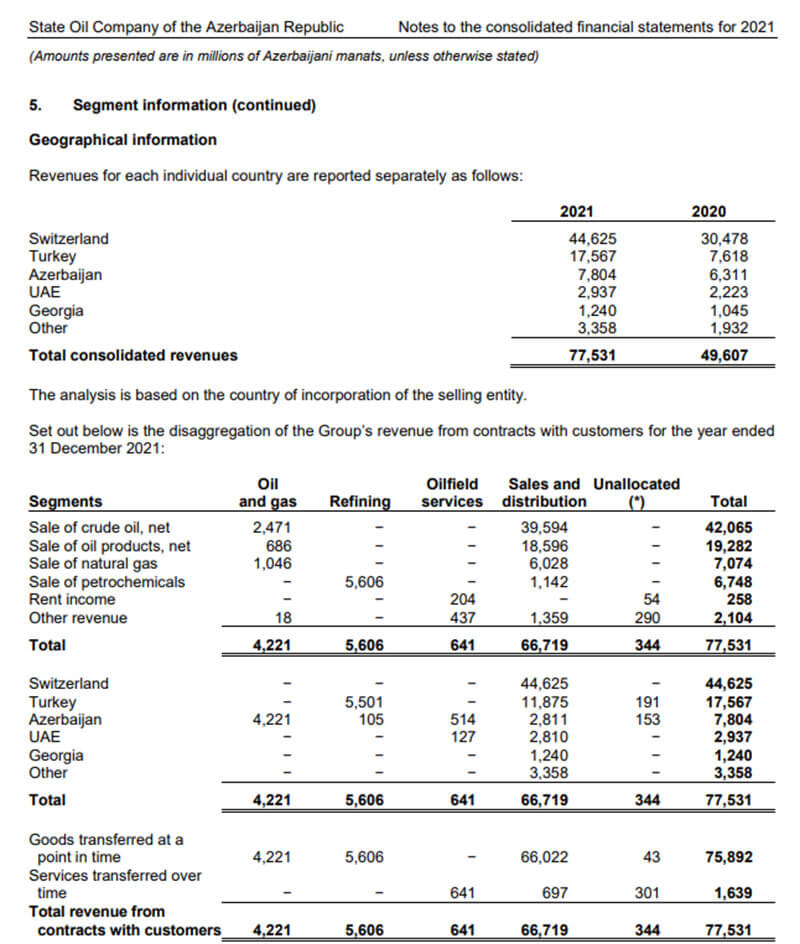 2021-ci ildə SOCAR Azərbaycandakı əməliyyatlardan 7 milyard 804 milyon manat (artım 23,7%), BƏƏ-dəki əməliyyatlardan 2 milyard 937 milyon manat (artım 32,1%), Gürcüstandakı əməliyyatlardan 1 milyard 240 milyon manat (artım 18,7%), digər ölkələrdəki əməliyyatlardan isə 3 milyard 358 milyon manat (artım 1,7 dəfə) gəlir əldə edib.