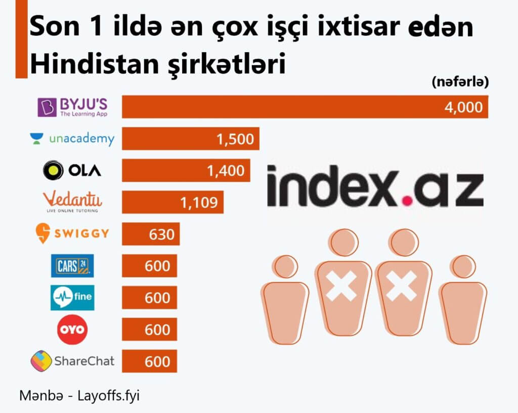 İndex.az xəbər verir ki, son 1 ildə 4,000 işçisini ixtisar edən "Byju's" bu cəhətdən Hindistanda liderdir. İkinci isə, 1,500 nəfər işçi ixtisar edən "Unacademy" şirkətidir.