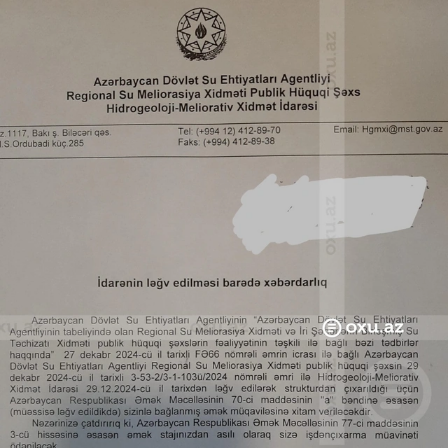 Hidrogeoloji-Meliorativ Xidmət İdarəsi 400-ə yaxın işdən azad edilib.