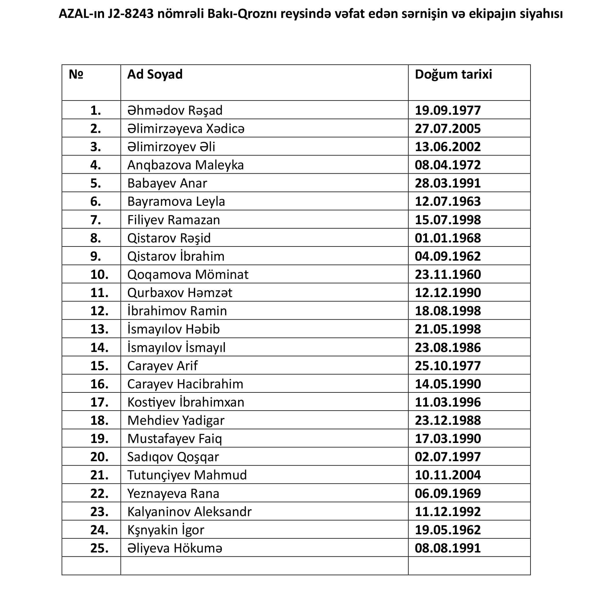 “Azərbaycan Hava Yolları” aviaşirkətinin J2-8243 nömrəli Bakı-Qroznı reysini yerinə yetirən “Embraer 190” təyyarəsinin Aktau şəhəri yazınlığında qəzaya uğraması nəticəsində vəfat edən sərnişinlərin və ekipaj üzvlərinin siyahısı açıqlanıb.