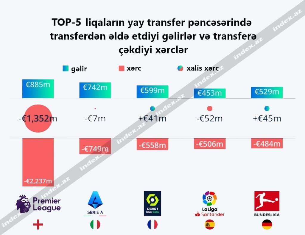 İndex.az TOP-5 liqaların yay transfer pəncərəsində transfer gəlirlərini və xərclərini sizə təqdim edir: