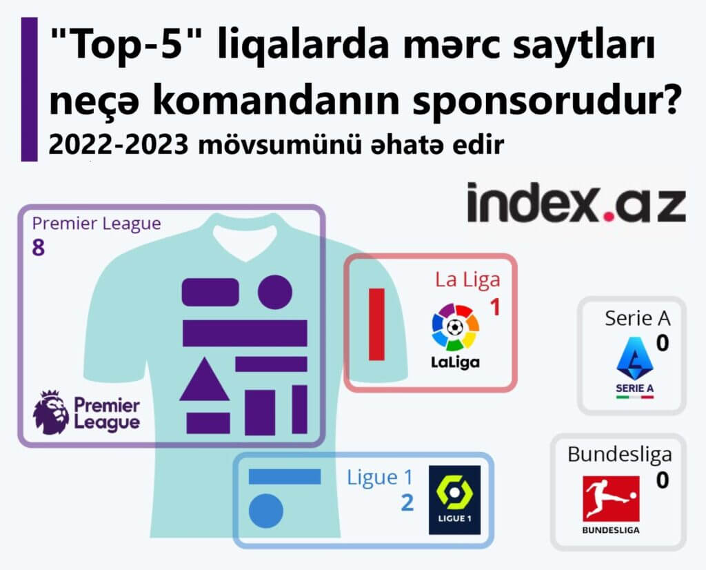 İndex.az xəbər verir ki, "İngiltərə Premyer Liqası"nda 8 komandanın sponsorları arasında mərc saytları da var. Bu göstəricidə ikinci Fransa liqasıdır. "Liqa 1"də 2 komandaya mərc saytları sponsorluq edir.