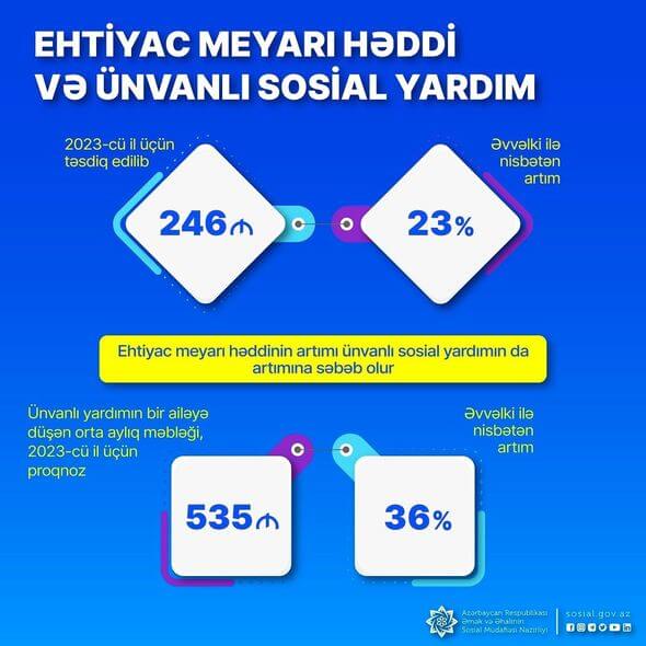 2023-cü il üçün ehtiyac meyarının həddi ötən ilə nisbətən 23 faiz artırılmaqla 246 manat müəyyən olunub ki, bu artımla ünvanlı yardımların da məbləği artacaq.