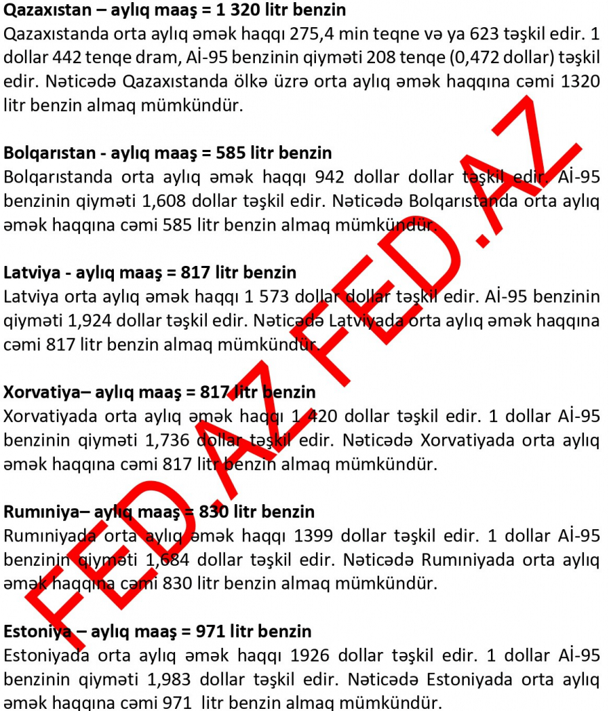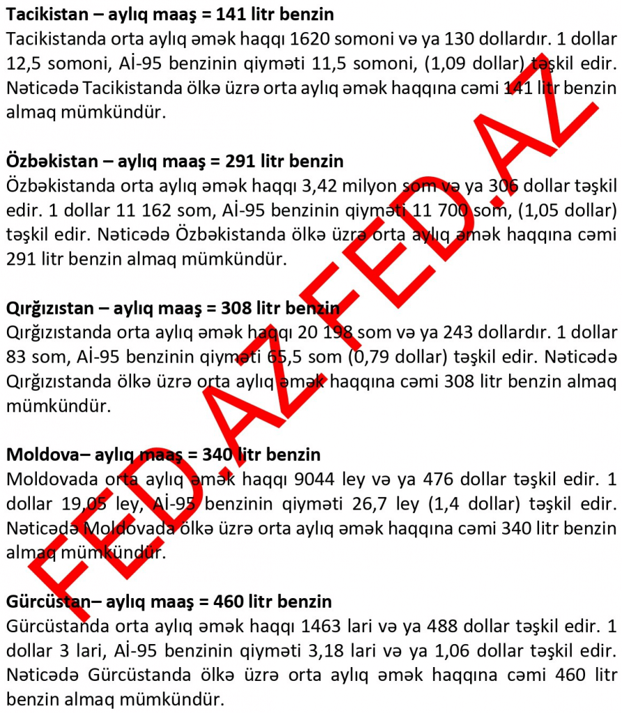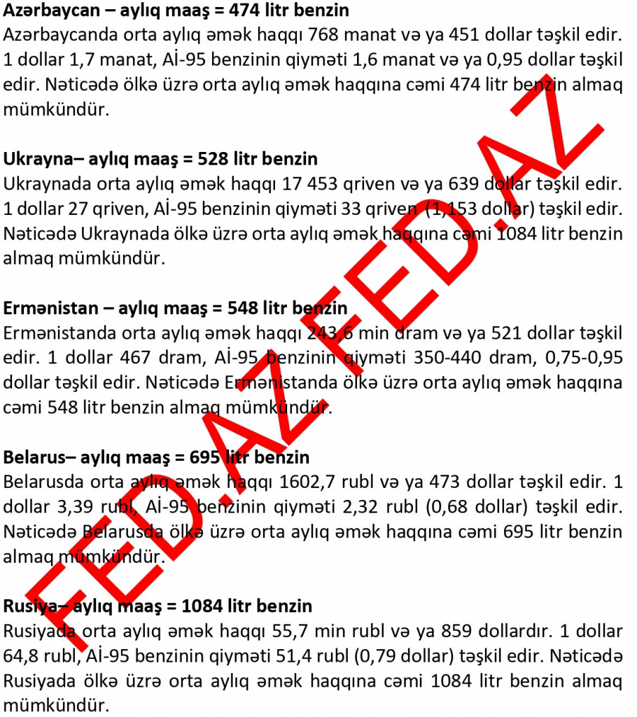 İndex.az xəbər verir ki, FED.az MDB ölkələri və bəzi Avropa ölkələrində Aİ-95 markalı benzinin qiyməti və ölkədəki orta aylıq əmək haqqı ilə neçə litr benzin almaq mümkün olduğunu araşdırıb.