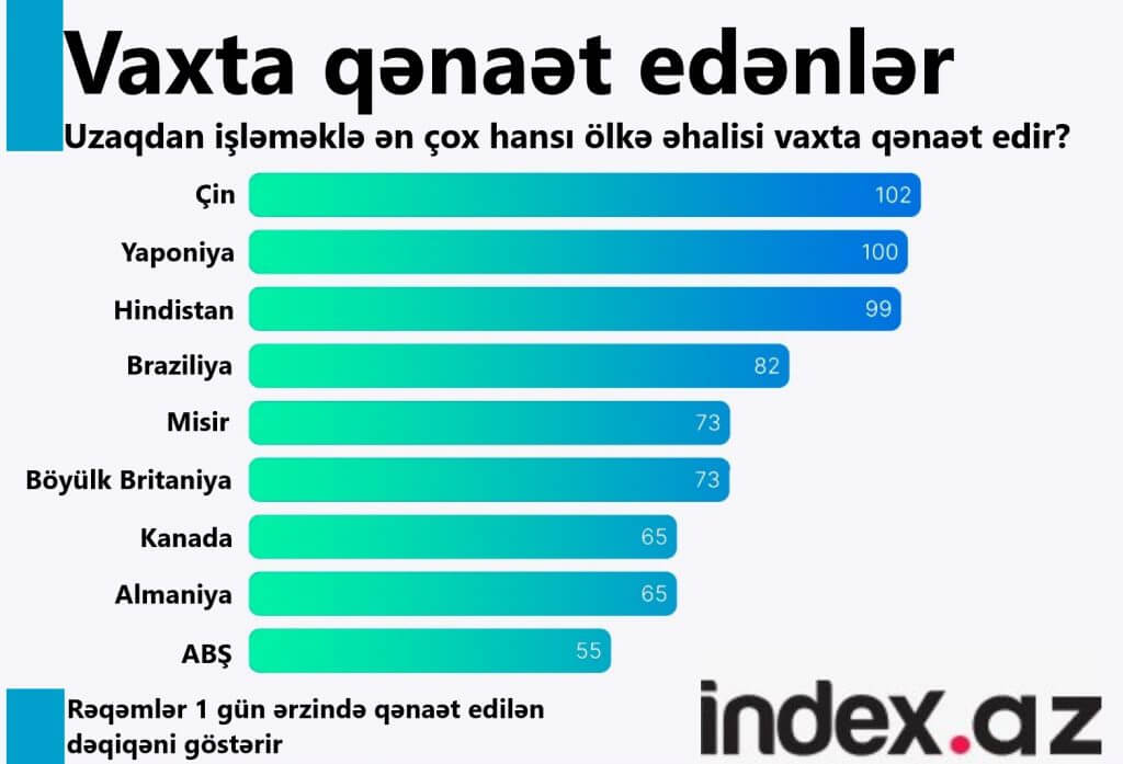 İndex.az xəbər verir ki, "Bloomberg"in hesablamalarına görə, Çin əhalisi iş yerindən uzaqda işləyərək gün ərzində ortalama 102 dəqiqə vaxtına qənaət edir. Bu göstəiricidə Yaponiya ortalama gündə 100 dəqiqəlik qənaətlə siyahıda ikinci, Hindistan isə 99 dəqiqəlik qənaətlə üçüncüdür.