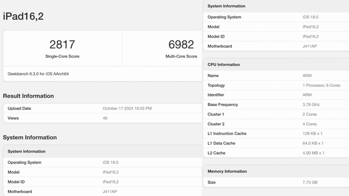 İndex.az xəbər verir ki, "İPad 16.2" olaraq qeydiyyatdan keçən planşet tək nüvəli testdə 2817, çoxnüvəli testdə isə 6982 xal toplayıb.