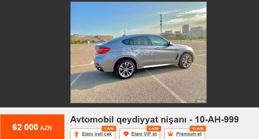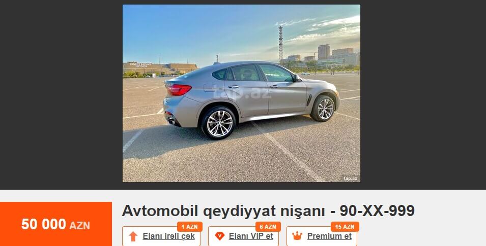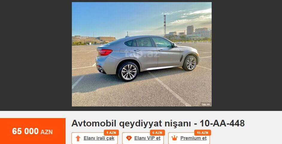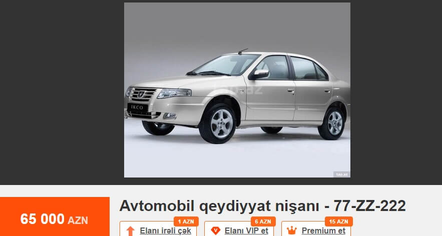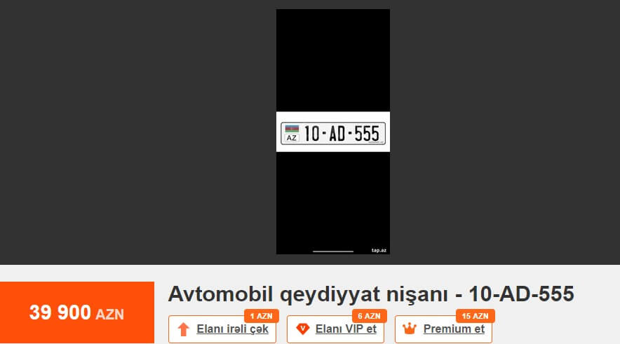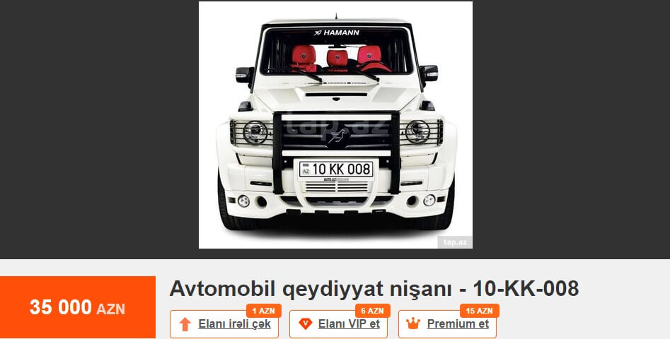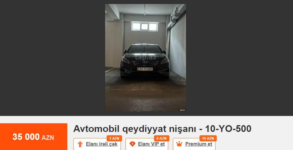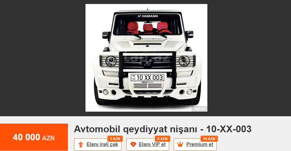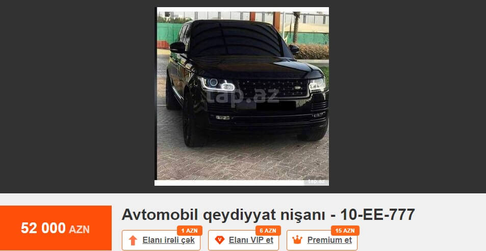 Tez-tez mətbuatda və sosial şəbəkələrdə dövlət qeydiyyat nişanının alınması prosesindən şikayətlər oxuyuruq. Bu barədə çox danışılıb və yazılıb. Məsələyə fərqli yanaşmaq istərdik. Məsələn, Tap.az elan saytındakı elanlara nəzər salaq. 10-AA-610 dövlət qeydiyyat nişanı 75 min manata, 10-AA-448 dövlət qeydiyyat nişanı 65 min manata, 77-ZZ-222 dövlət qeydiyyat nişanı 65 min manata, 10-AH-999 dövlət qeydiyyat nişanı 62 min manata, 10-EE-777 dövlət qeydiyyat nişanı 52 min manata, 90-XX-999 dövlət qeydiyyat nişanı 50 min manata, 90-OO-012 dövlət qeydiyyat nişanı 40 min manata, 10-XX-003 dövlət qeydiyyat nişanı 40 min manata, 10-AD-555 dövlət qeydiyyat nişanı 39 900 manata, 10-YO-500 dövlət qeydiyyat nişanı 35 min manata, 10-KK-008 dövlət qeydiyyat nişanı 35 min manata satılır.