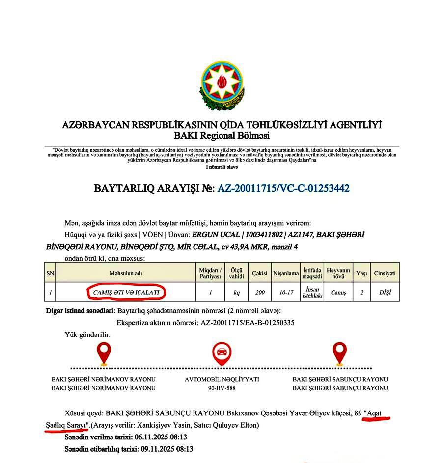 Yoxlama zamanı şadlıq sarayında qonaqların istehlakına dana əti adı ilə təqdim olunan ətin müvafiq baytarlıq sənədi ilə təmin edilən camış əti olduğu, menyuda bununla bağlı hər hansı bir məlumat verilmədiyi müəyyən edilib. Camış əti qida təhlükəsizliyi riski yaratmasa da, bu hal istehlakçıların aldadılaraq hüquqlarının kobud şəkildə pozulmasına səbəb olur. Həmçinin yoxlama zamanı şadlıq evində soyuq qəlyanaltıların hazırlanması sahəsində işçi masaların səthlərinin tamlığının pozulduğu, mətbəx sahəsində rəflərin korroziyaya uğradığı, eləcə də digər sanitar-texniki və sanitar-gigiyenik nöqsanlar aşkarlanıb.