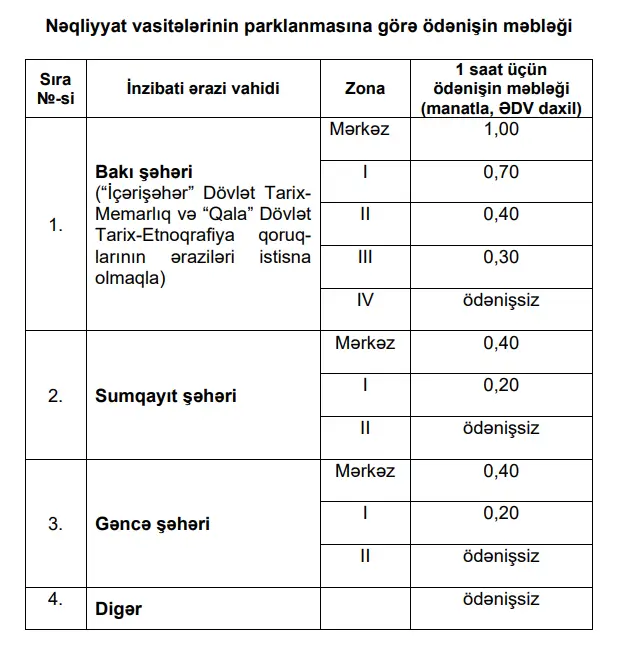 Qeyd edilib ki, nəqliyyat vasitələrinin parklanmasına görə ödənişin məbləği əlavədə nəzərdə tutulan zonalara uyğun olaraq müəyyən edilir.