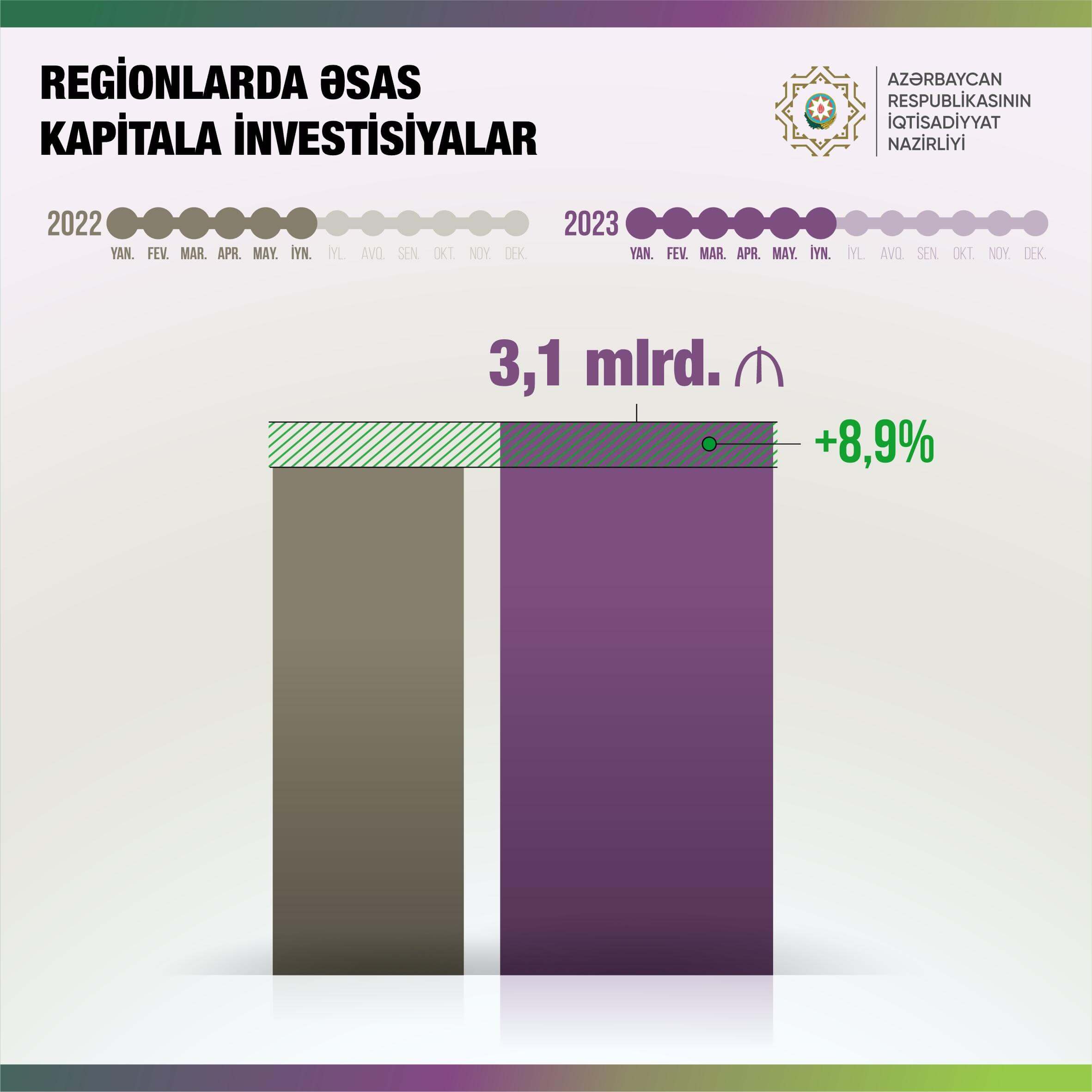 Bu ilin yanvar-iyun aylarında Azərbaycan regionlarında əsas kapitala investisiyalar 2022-ci ilin müvafiq dövrü ilə müqayisədə 8,9% artıb.
