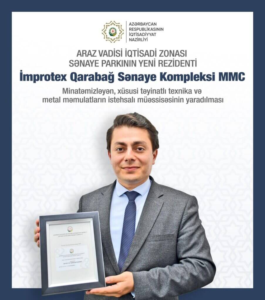 İqtisadiyyat Nazirliyinin "Araz Vadisi İqtisadi Zonası" Sənaye Parkında "İmprotex Qarabağ Sənaye Kompleksi" MMC-yə rezident statusu verilib.