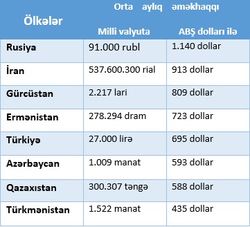 Şimal-qərb qonşumuz olan Gürcüstanda isə minimum əməkhaqqı 20 lari (7$) olsa da, orta aylıq əməkhaqqı 2 min 217 lari (809$) təşkil edir.