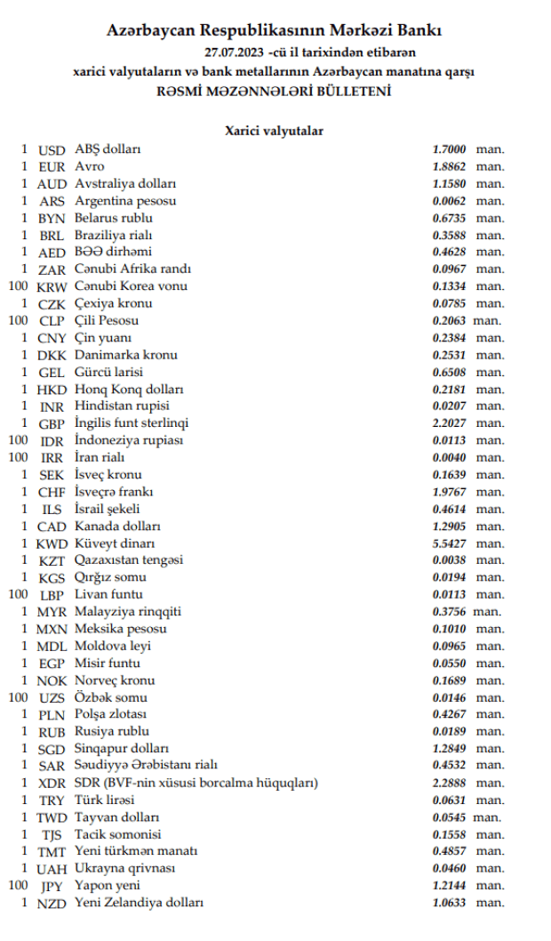 DOLLAR 1.70 0% AVRO 1.99 -0.19% QIZIL 4,367.45 0.53% GÜMÜŞ 66.58 4.1% WTI NEFT 56.09 1.69% BRENT 59.85 1.53% TƏBİİ QAZ 4.07 4.84% DOLLAR 1.70 0% AVRO 1.99 -0.19% QIZIL 4,367.45 0.53% GÜMÜŞ 66.58 4.1% WTI NEFT 56.09 1.69% BRENT 59.85 1.53% TƏBİİ QAZ 4.07 4.84%
