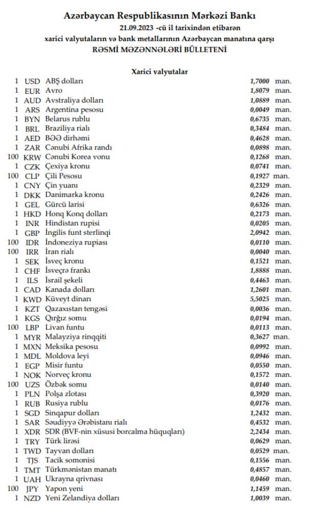 ValyutaMəzənnə1 ABŞ dolları1,70001 Avro1,9921100 Rusiya rublu2,12801 Avstraliya dolları1,12351 Belarus rublu0,58701 Bolqarıstan levi1,01861 BƏƏ dirhəm...