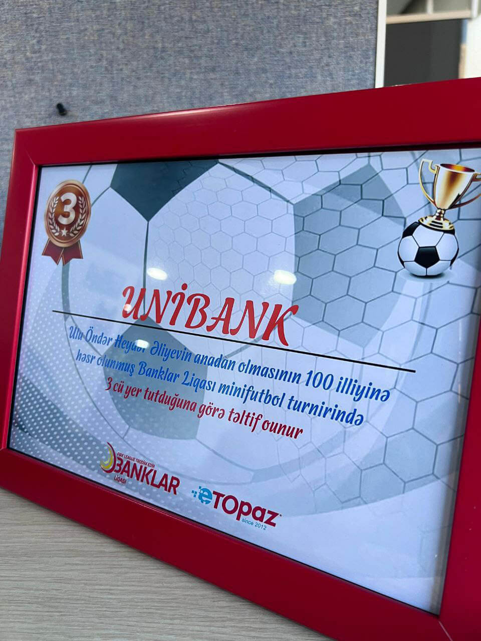 “Unibank” komandası Ümumilli Lider Heydər Əliyevin anadan olmasının 100 illiyinə həsr olunmuş Banklar liqası minifutbol turnirində 3-cü yerin qalibi olaraq, bürünc medalla mükafatlandırılıb.